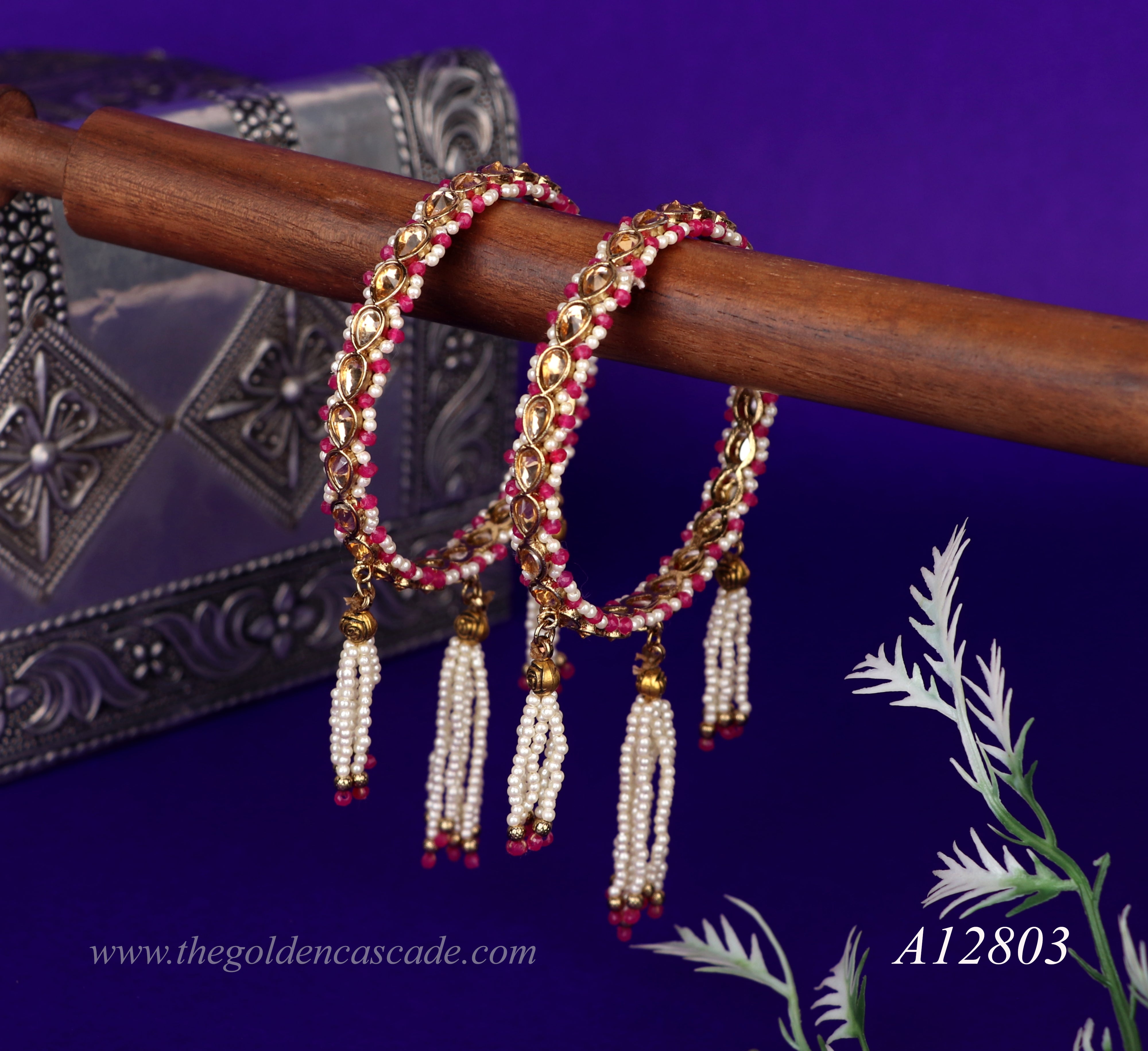 Kundan Studded Gold Plated Metal Kada for Women | Traditional Pearl Latkan Design | Ethnic Indian Jewelry for Weddings, Festivals & Special Occasions