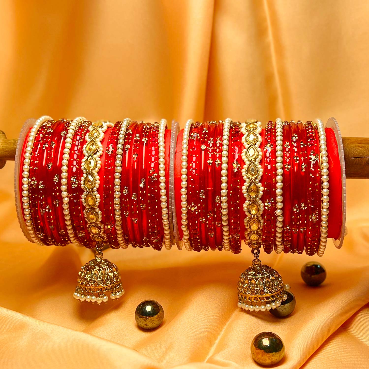 Traditional Red Glass Bangle with Pearl & Metal Jhumki Kada Set for Women