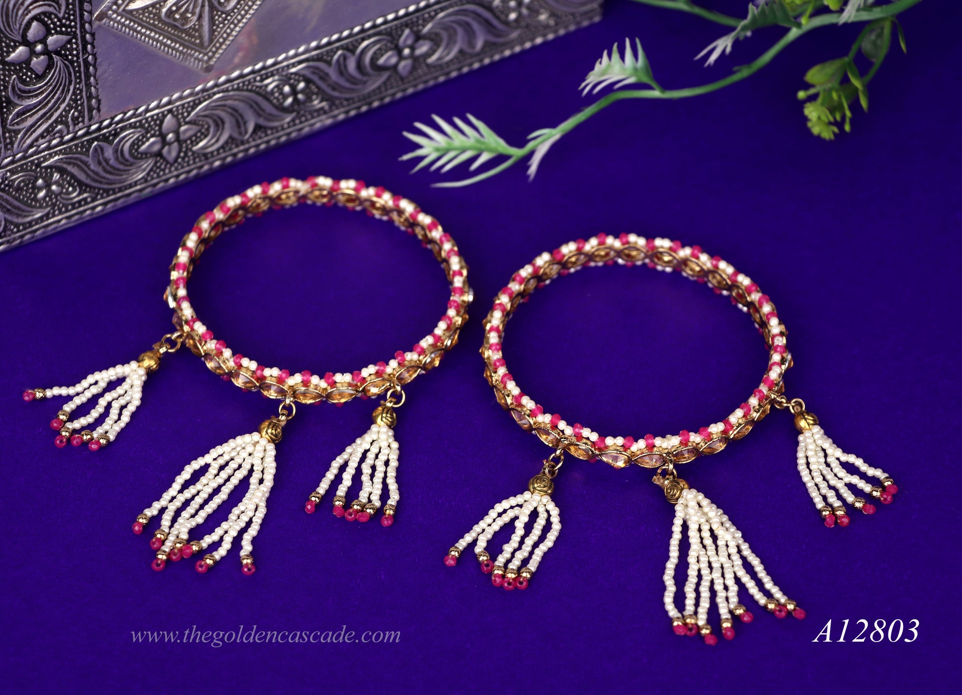 Kundan Studded Gold Plated Metal Kada for Women | Traditional Pearl Latkan Design | Ethnic Indian Jewelry for Weddings, Festivals & Special Occasions