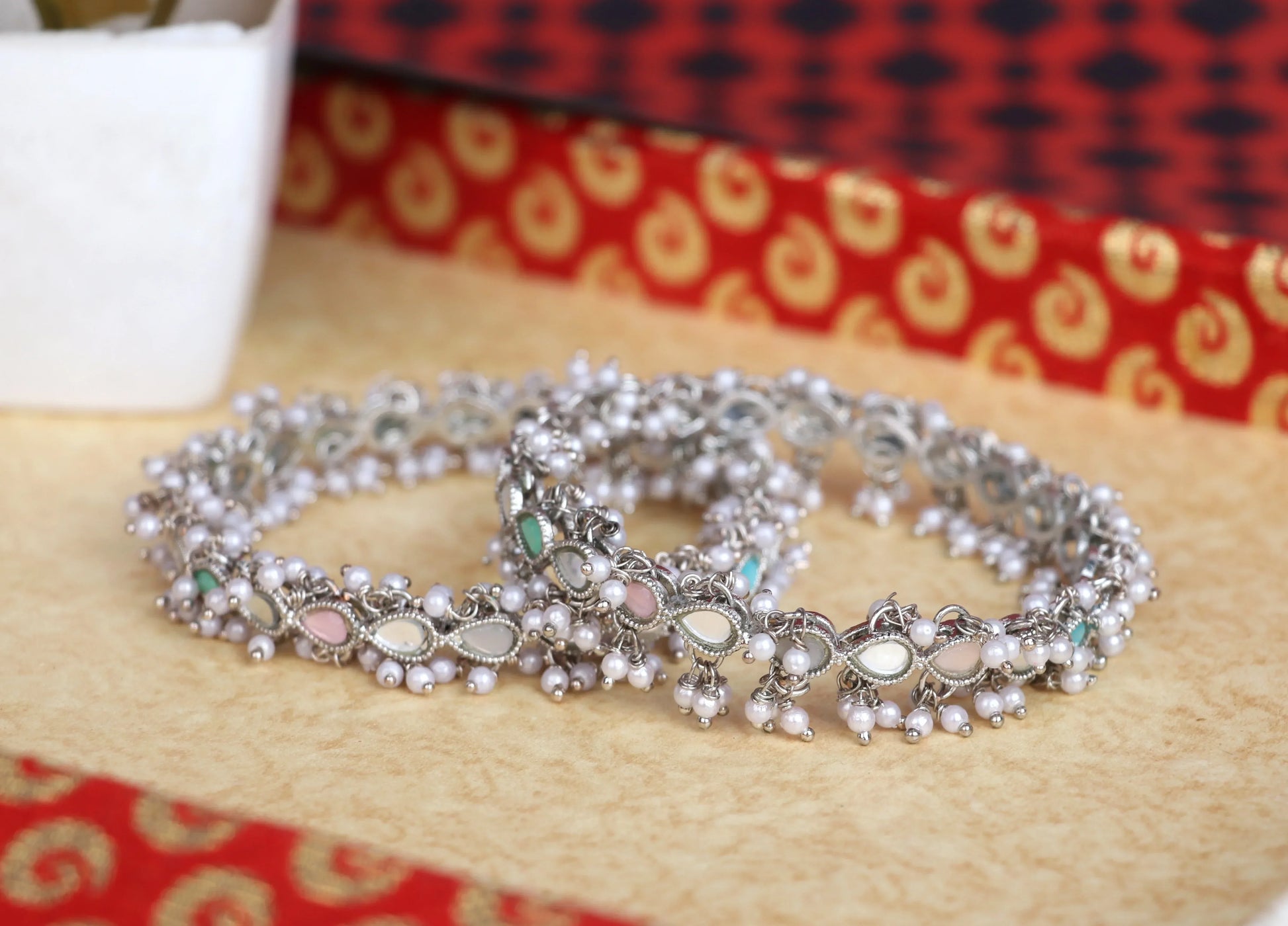 Multicolor Mirror Work Metal Kada for Women with Pearl (Pack Of 2)