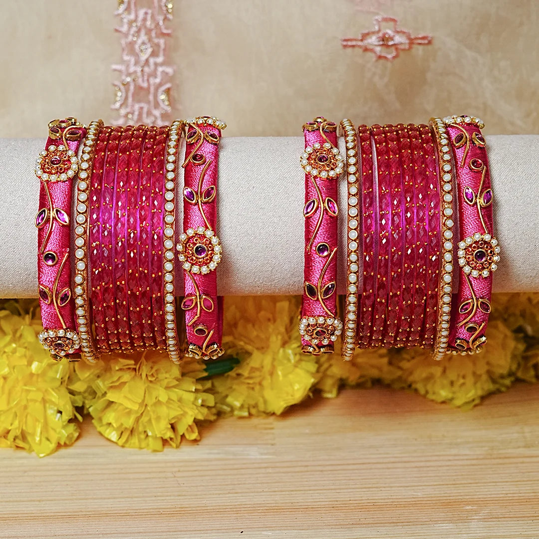 Traditional Thread Work Mini Glass Bangles Set for Women (Both Hands)